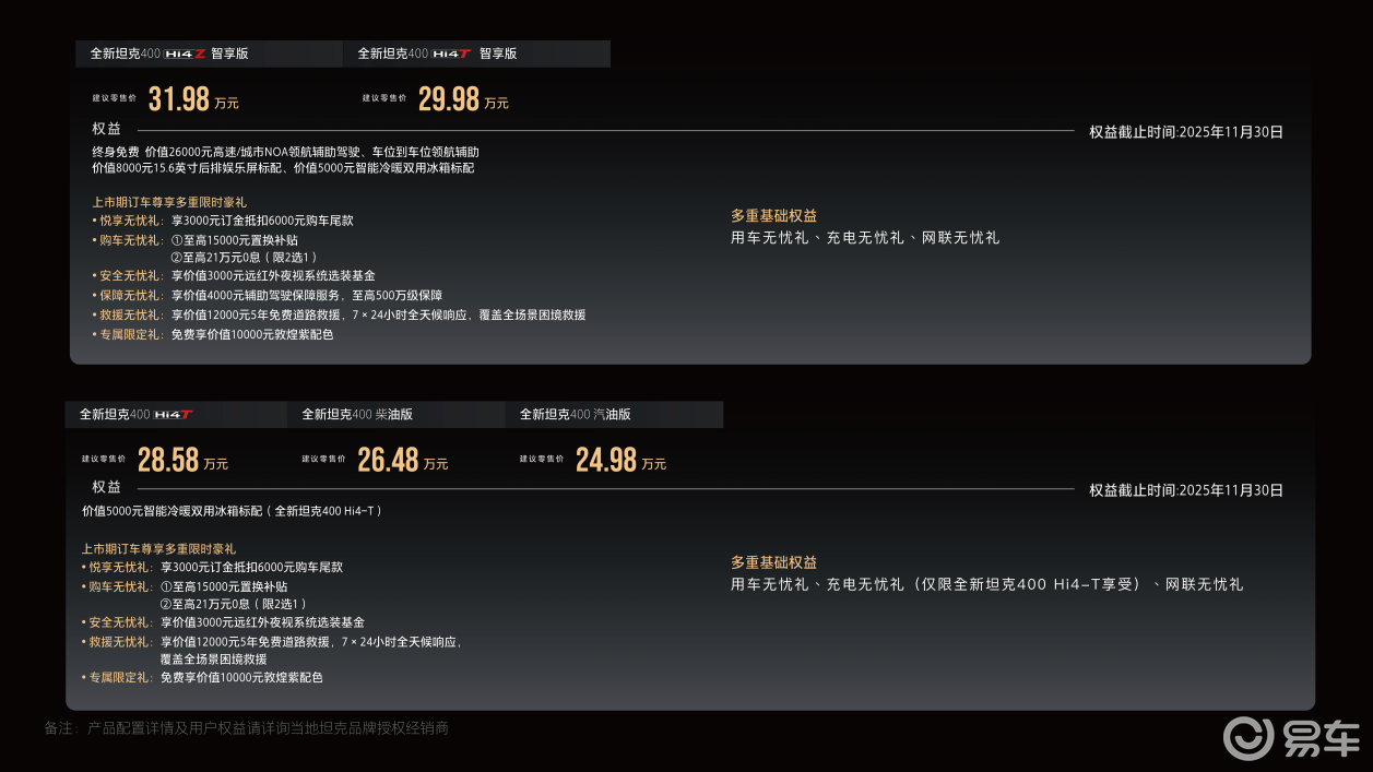 其中全新坦克400 Hi4-Z智享版,售价31.98万元;全新坦克400 Hi4-T智享版,售价29.98万元;全新坦克400 Hi4-T,售价28.58万元;全新坦克400 柴油版,售价26.48万元;全新坦克400 汽油版,售价24.98万元。