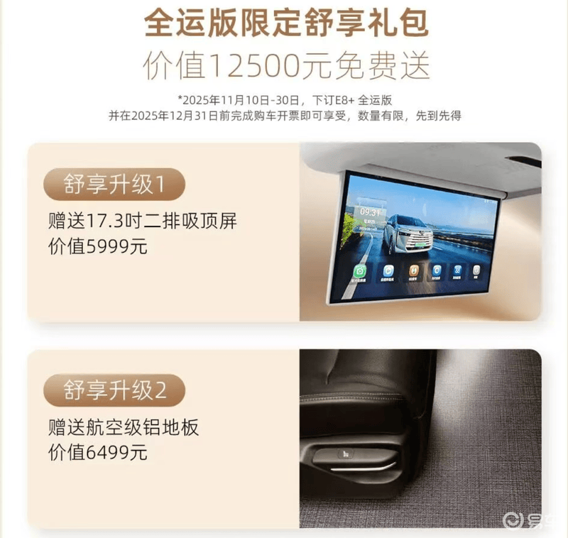 同时官方推出E8+全运版限定舒享礼包,价值12500元免费送,包括,可触屏的17.3英寸二排吸顶屏,价值5999元;还有价值6499元的航空级铝地板。