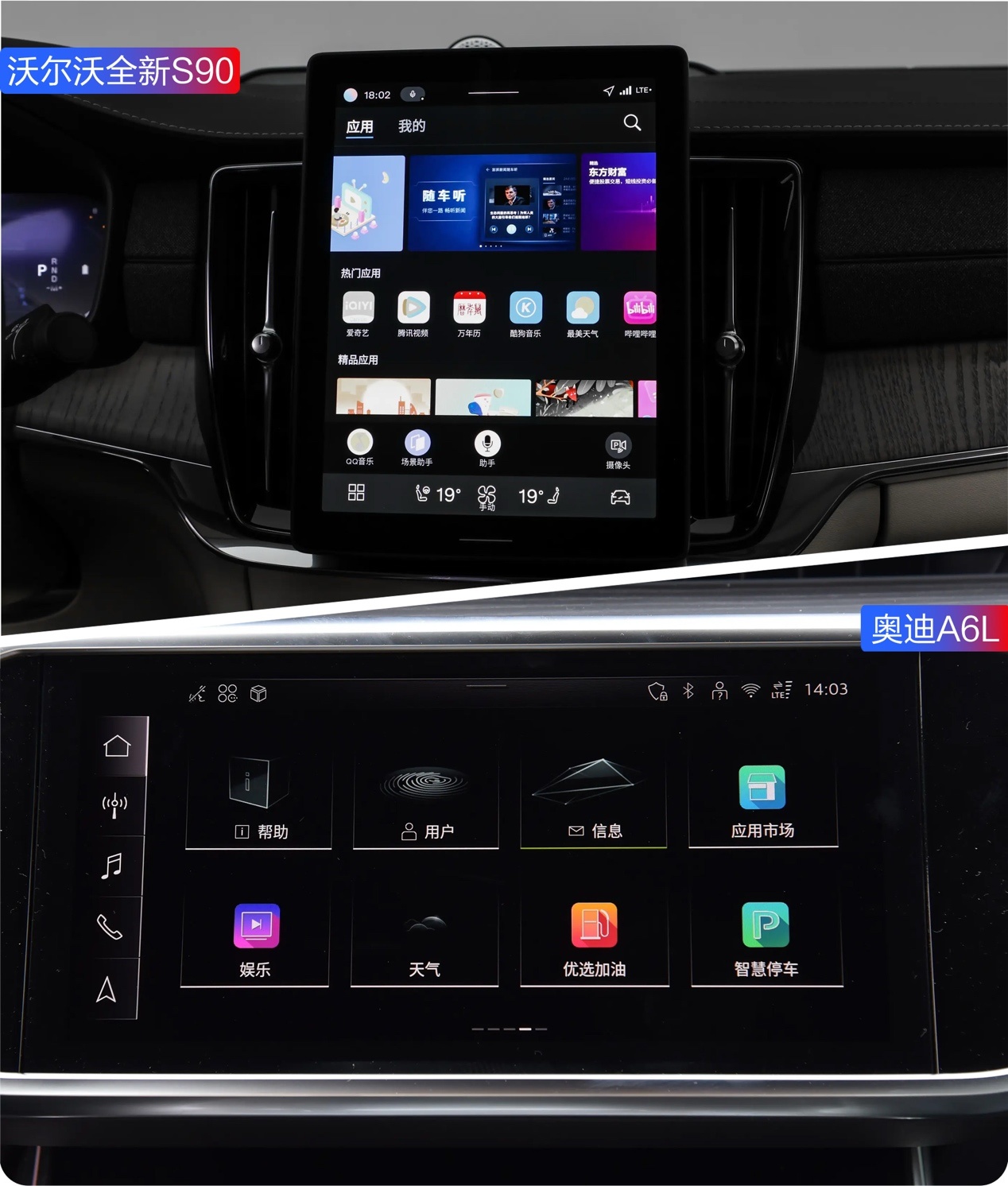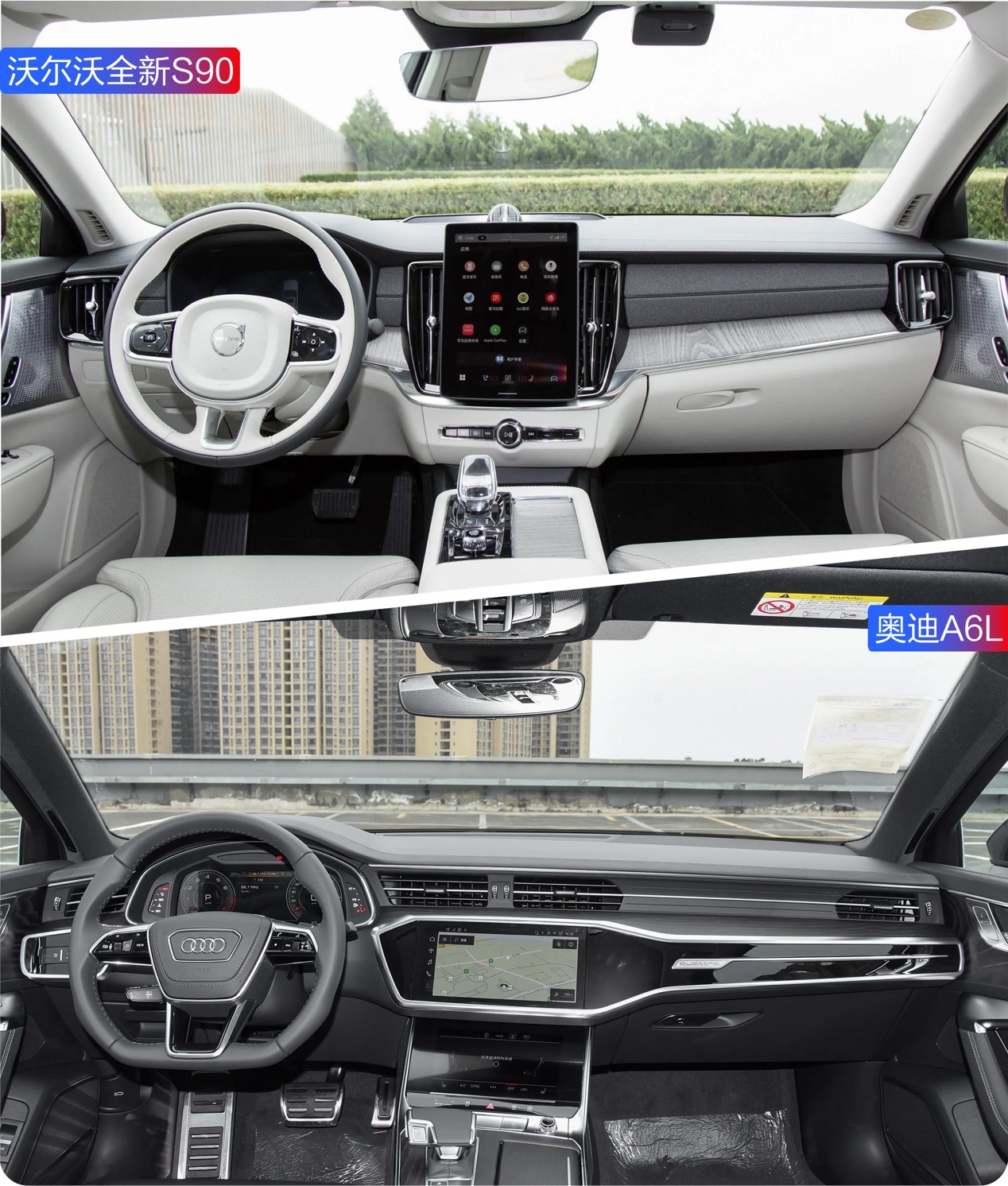 两车的内饰呈现出截然不同的气质与感受,沃尔沃全新S90简约、清新的设计带来典雅、温和的感受,天然原木饰板、温润且细腻,再加上精心设计的配色、瑞典皇室御用Orrefors®水晶换挡杆,一眼豪华。A6L的内饰给人感觉更冷峻,大角度的折线勾勒出强烈的层次感,上下两块大屏的设计也营造出了更强的科技感。