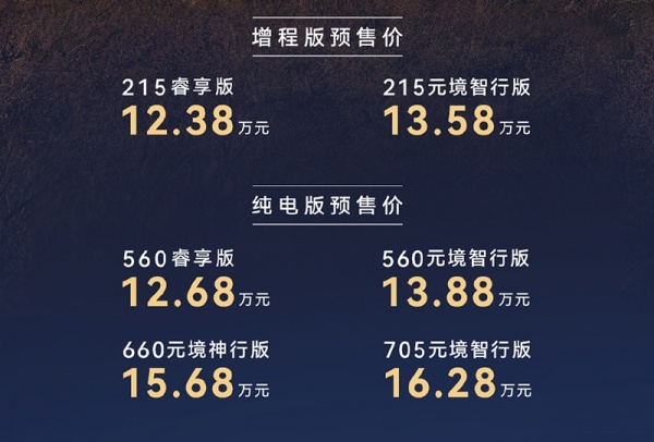 动力方面,新车搭载1.5L增程动力,其他发动机最大功率77kW,电机最大功率200kW,峰值扭矩360N·m。并标配宁德时代骁遥电池,CLTC纯电续航215km,综合续航1215km。纯电版提供两种不同单电机,最大功率分别为185kW、200kW,峰值扭矩分别为320N·m、360N·m。CLTC纯电续航提供560km、660km及705km。