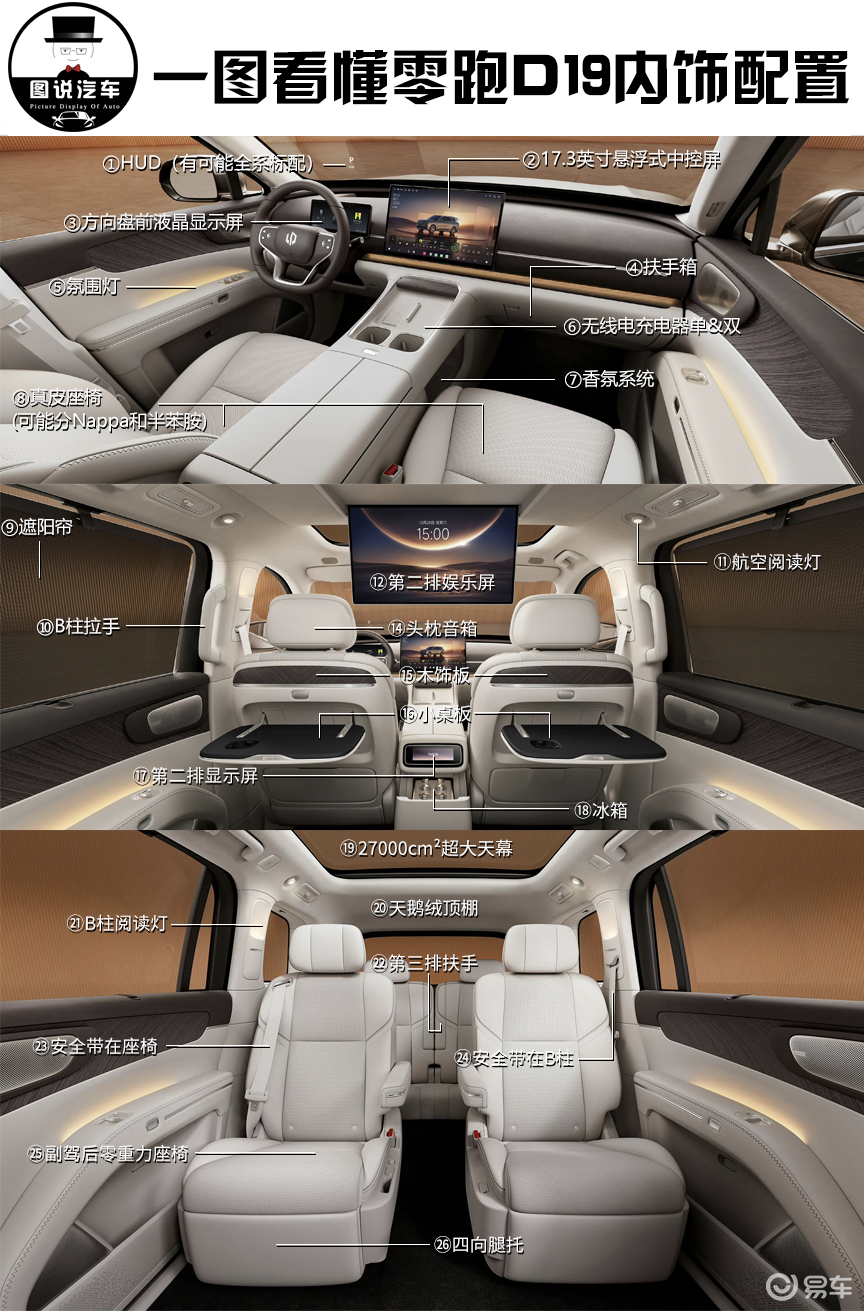 零跑D19尺寸5252*1995*1800/1780mm,轴距3110mm,支持6/7座,七座采用2+3+2布局,可以变身大5座,有增程版本和纯电。