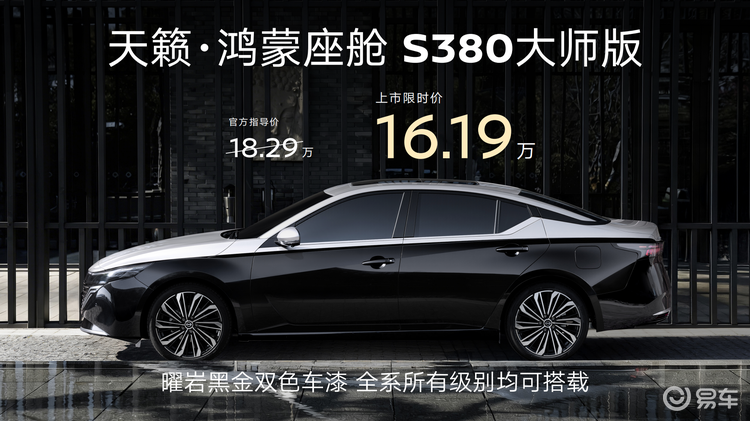 东风日产天籁·鸿蒙座舱S380大师版上市限时价为16.19万元。外观采用曜岩黑金双拼色车身及曜夜黑红内饰。智能配置方面,搭载鸿蒙座舱5系统,配备MoLA大模型AI智慧语音助手、AI智慧语音导航及3D智控桌面。动力方面,新车搭载2.0T VC-Turbo发动机,最大马力243匹,峰值扭矩371牛米。