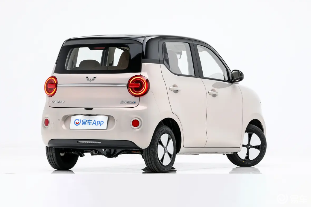 车尾部分,全新五菱宏光MINIEV的设计很有层次感,车顶配备有小尺寸扰流板和高位刹车灯,圆形尾灯组进行了熏黑处理,也被贯穿式镀铬条相连,整体造型与前大灯组相呼应。此外,新车还配备了立体感十足的后包围,风格比较个性。