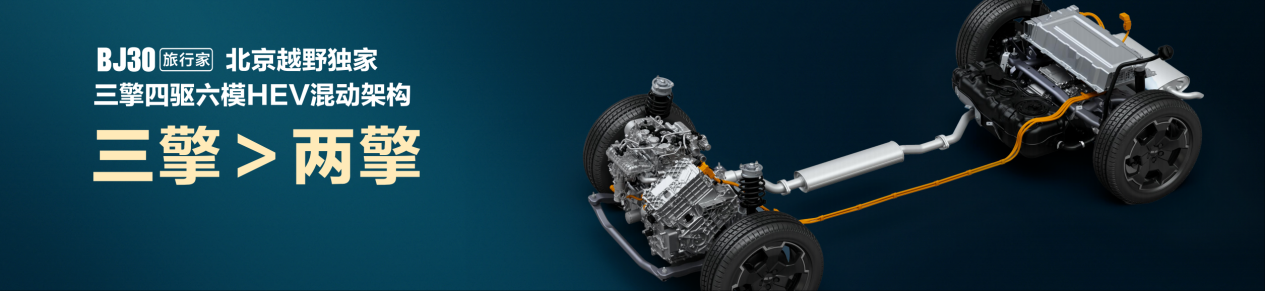 三擎混动,节能宗师!BJ30旅行家要做最省的轻越野旅行SUV,采用北京越野独家研发的“三擎四驱六模HEV混动架构”,百公里综合油耗低至5.85L,具备纯电、串联、并联、直驱、能量回收、驻车充电六大动力模式,系统会根据车速、路况、油门深度等参数,在各种模式间智能切换;搭载混动专用发动机,是保时捷同款黑科技,热效率高达41%。