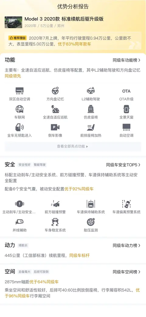 这辆二手Model 3是一款2020款的标准续航后驱升级版,车身颜色为黑色,上牌地是郑州。自2020年7月上牌以来,已经行驶了5万公里,并有过一次过户记录。按照新能源车正常的年均行驶里程计算,这辆车的年均行驶里程为1.25万公里,属于正常值。这辆车的新车指导价为29.18万元,目前二手车报价为11.68万元。按全国新能源车销量排行,该车排进了Top1。