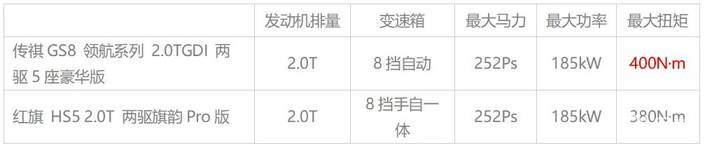 传祺GS8 领航系列 2.0TGDI 两驱5座豪华版 指导价:15.98万;红旗 HS5 2.0T 两驱旗韵Pro版指导价:18.68万,指导价相差2.7万元。