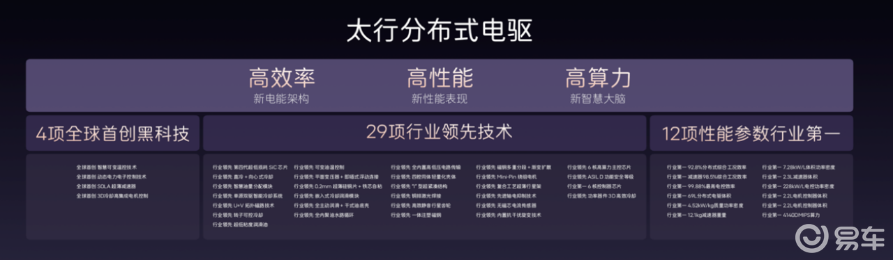 太行分布式电驱系统集4项全球首创黑科技、12项行业第一参数、29项行业领先技术于一身,具备高效率、高性能、高算力三大核心优势。在效率方面,电驱系统工况效率超过92.8%,位居全球第一,在功率大幅提升的同时实现续航几乎零折损;在性能方面,体积功率密度达到行业第一,以更小的体积释放更强的动力输出;在算力方面,搭载全球最高六核电机控制器芯片,每秒可处理40亿条指令,带来闪电般的扭矩响应与精细入微的动力控制。