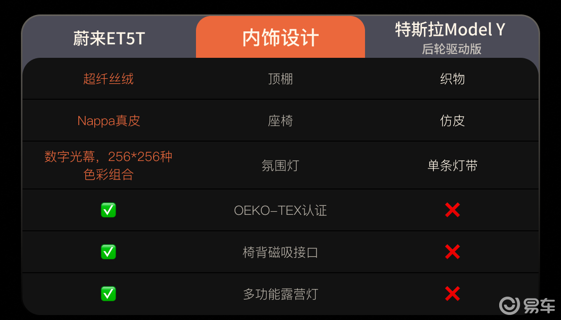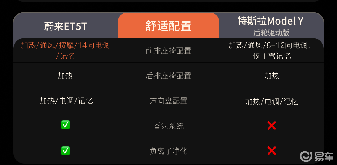车型对比结论:蔚来 ET5T 舒适配置拉满,Model Y 基础够用