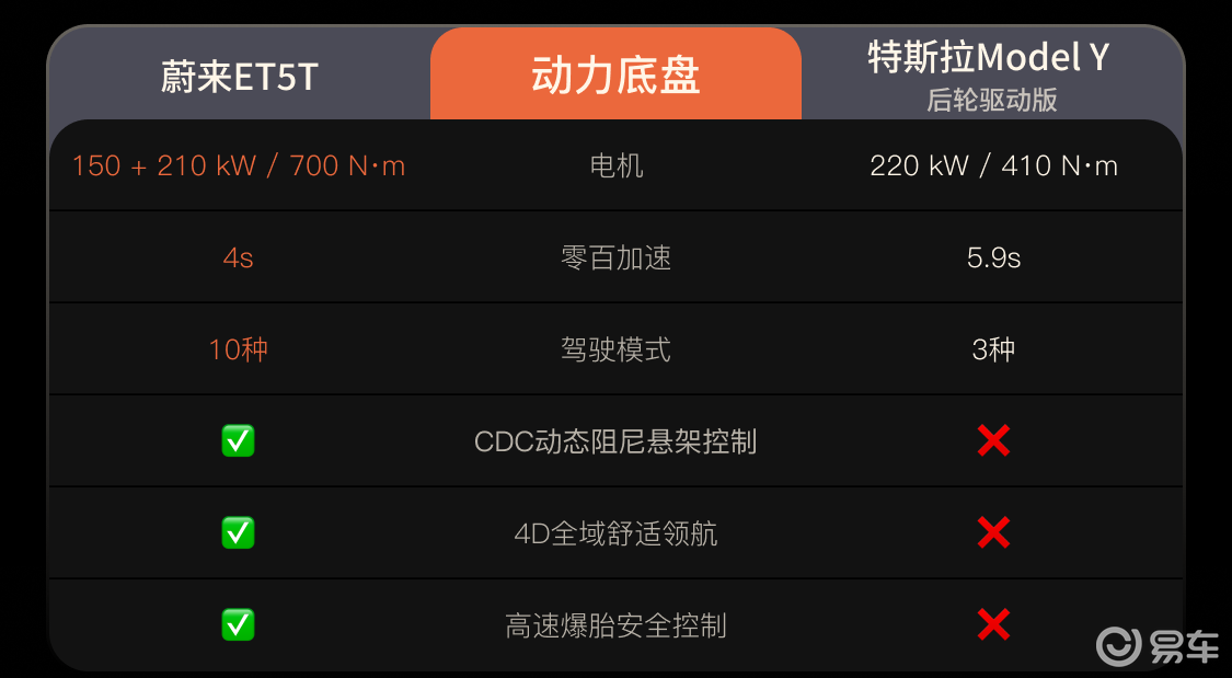 车型对比结论:蔚来 ET5T 性能碾压,Model Y 家用够用